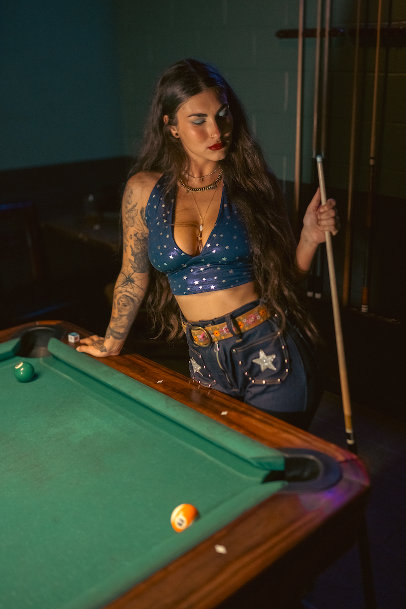 Woman in a retro blue star-patterned top  and funky high waisted studded bell bottom jeans, standing next to a pool table holding a cue.