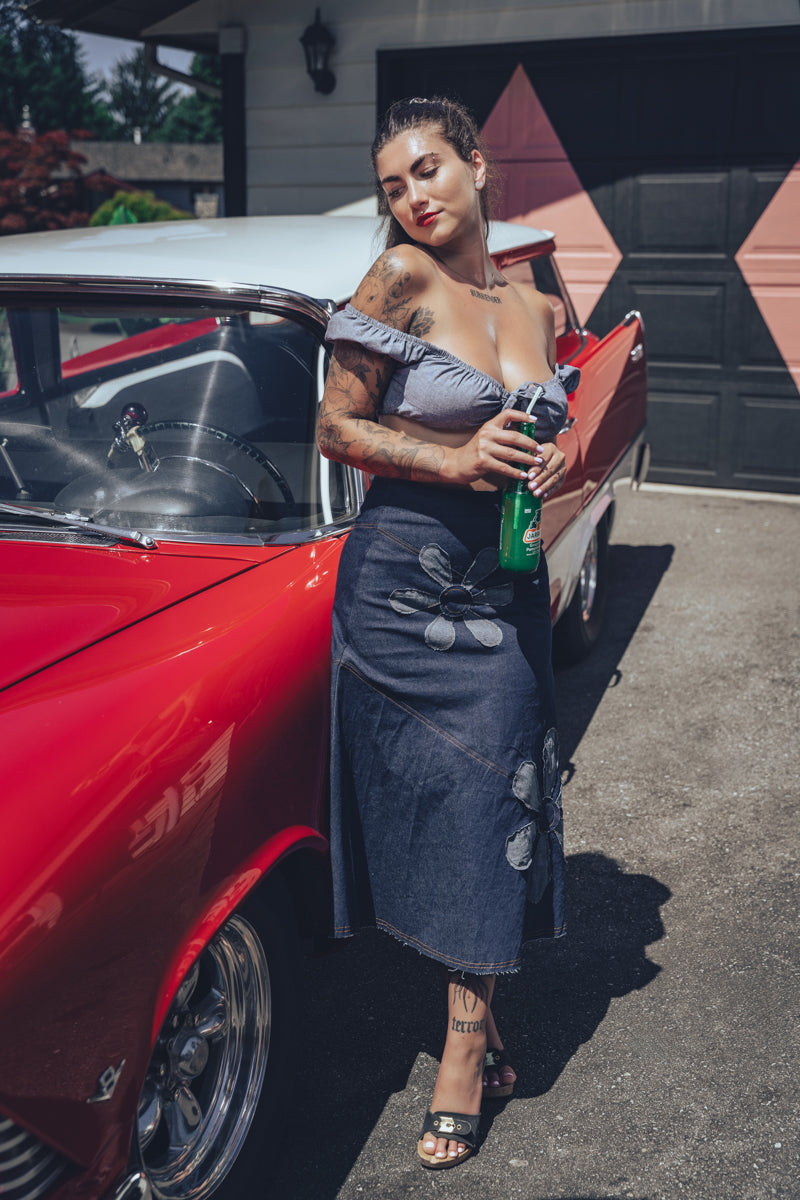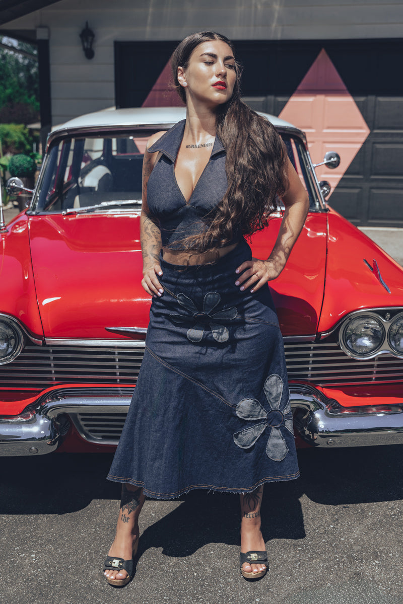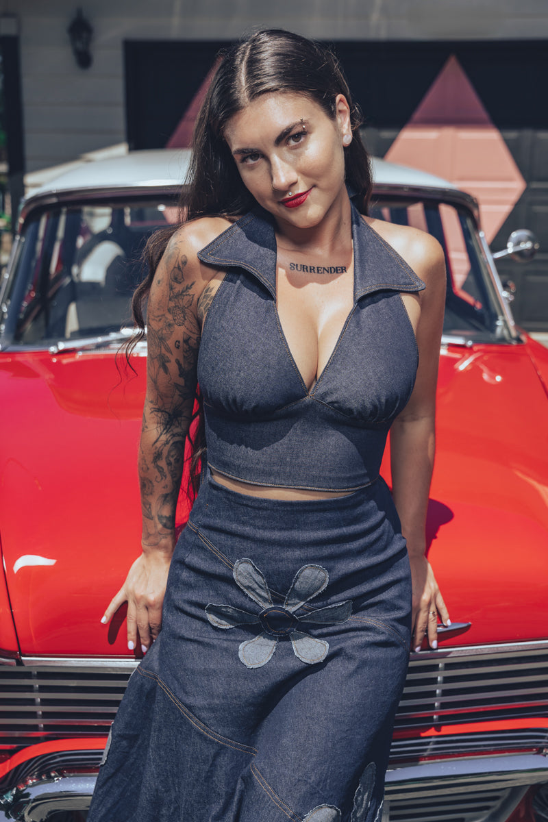 Nuestra falda vaquera Flower Power es imprescindible para los espíritus libres y los días de festival. Con su corte favorecedor y detalles de inspiración retro, está hecha para bailar bajo el sol o pasear por las calles de la ciudad. Combínala con un top halter o un top corto y saca a la niña flor que llevas dentro.