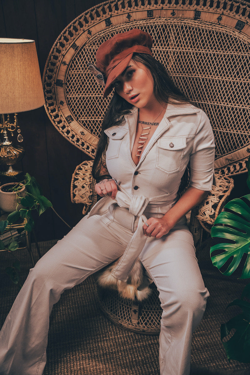 Notre tronçon emblématique, Cette luxueuse combinaison en velours côtelé crème, d'inspiration rétro, est la pièce maîtresse de votre look ! Avec sa coupe flatteuse et ses jambes évasées, elle ne manquera pas de faire tourner les têtes. Cette combinaison incarne à merveille l'esprit groovy des années 70 !