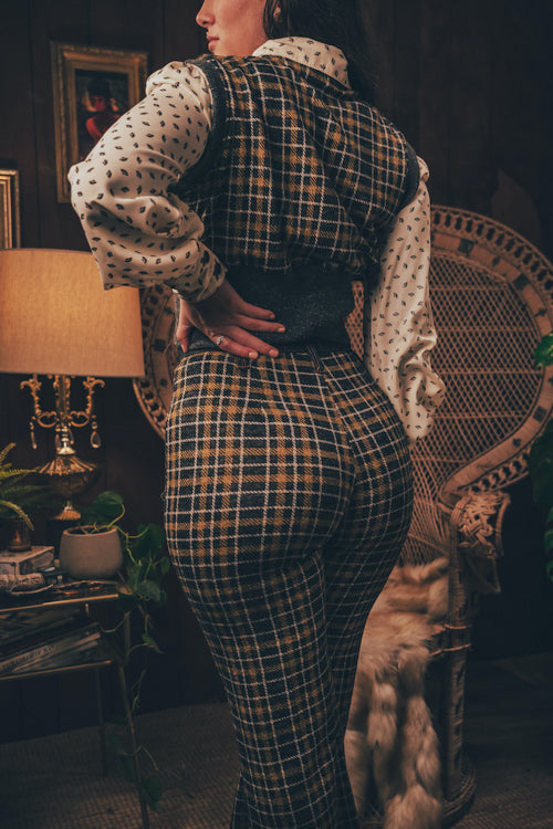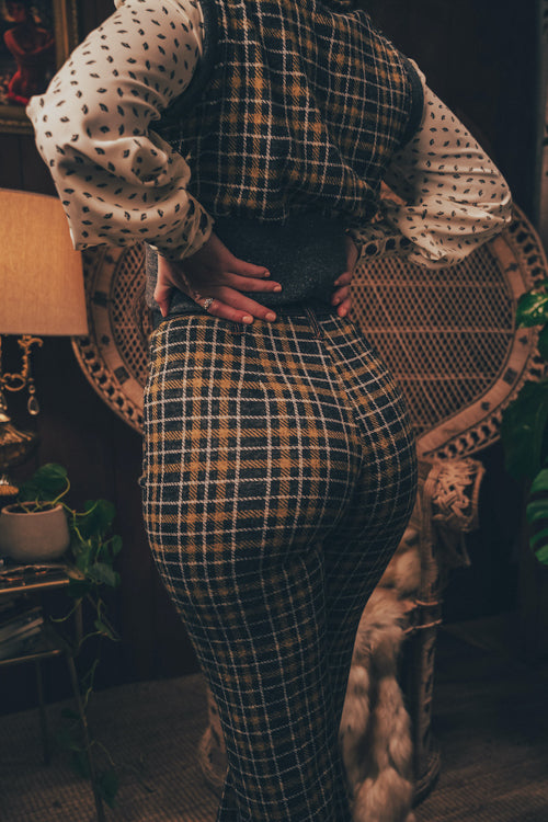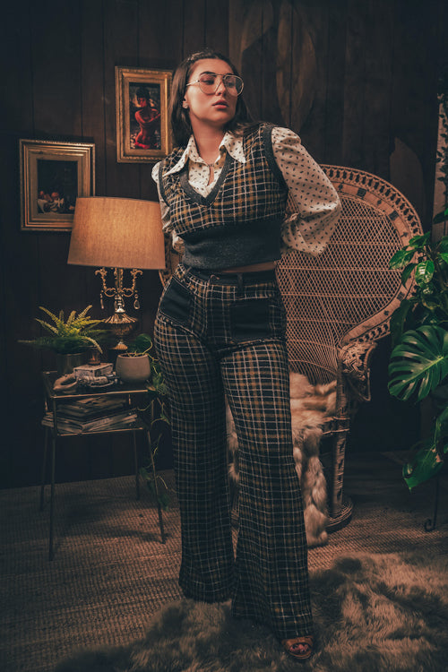 Adoptez un look funky avec le gilet Viola à carreaux, une pièce d'inspiration vintage qui épouse vos courbes à la perfection. Sa coupe ajustée et son décolleté en V plongeant lui confèrent une allure décontractée des années 70, que vous le portiez seul ou superposé à un chemisier ou un pull à col roulé. Associez-le aux pantalons Stevie Bells à carreaux assortis ou à notre jupe Viola assortie pour un look chic de la tête aux pieds, un pur enchantement rétro !