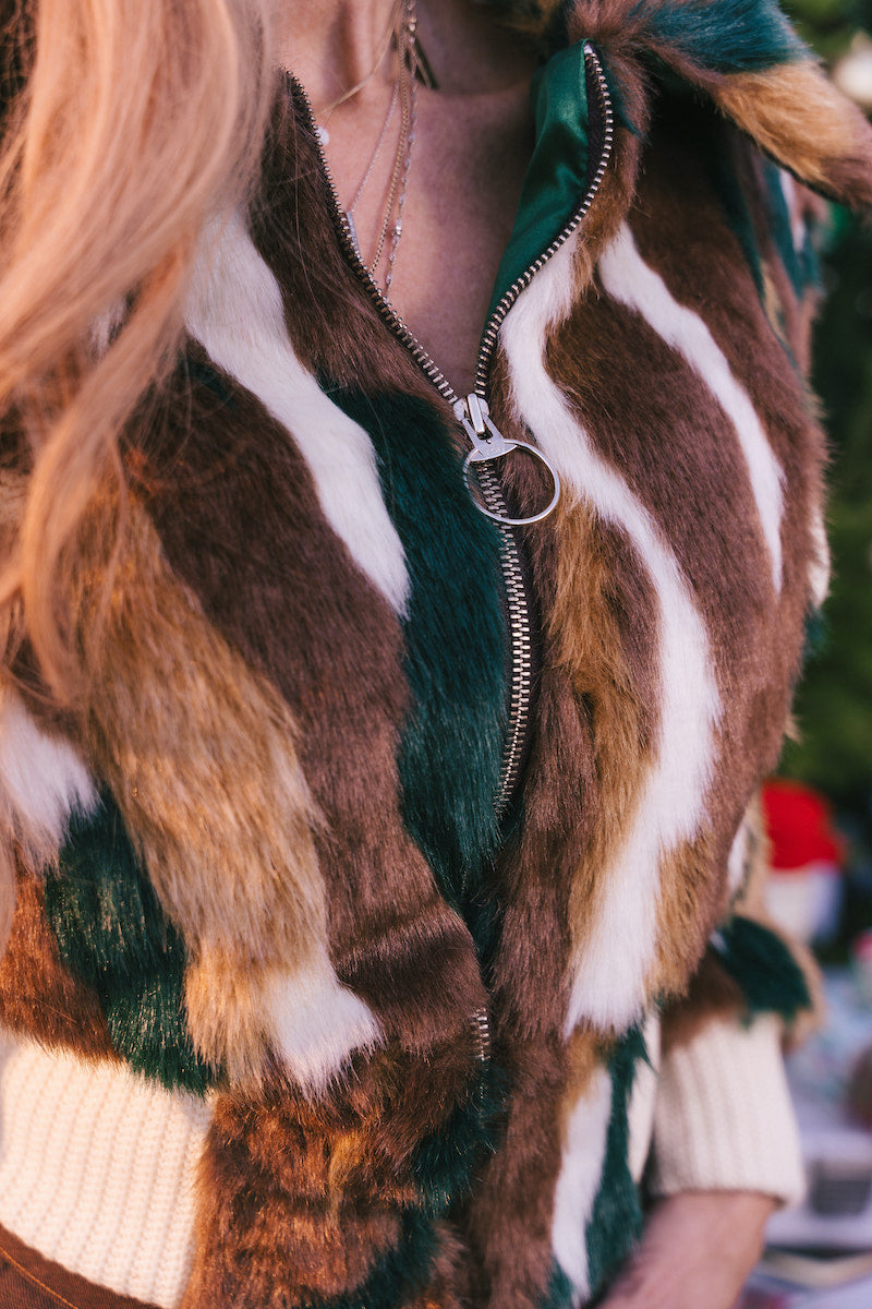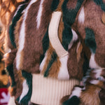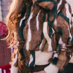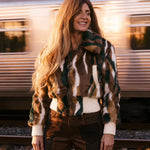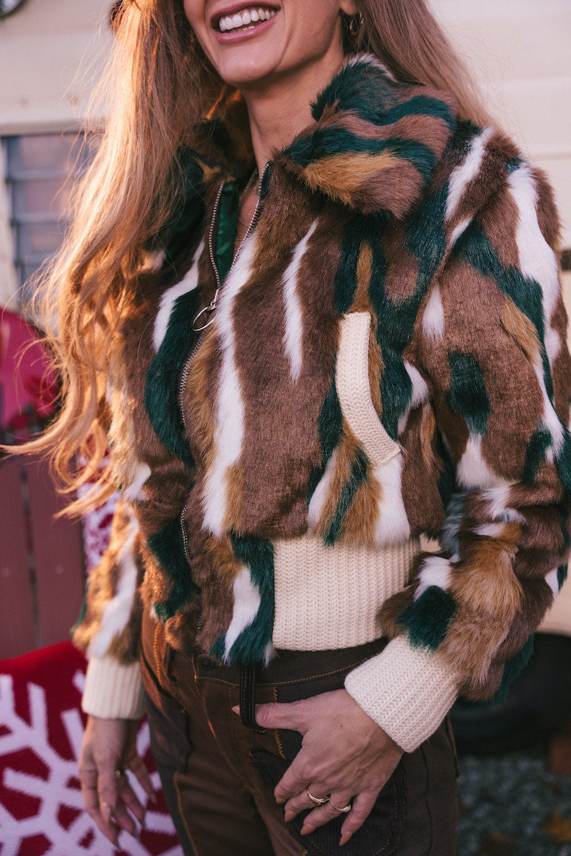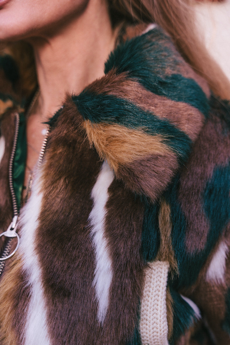 Enfilez ce blouson bomber multicolore en fausse fourrure et plongez dans un rêve des années 70. Sa doublure en satin vert, sa fourrure douce marron et crème et sa fermeture éclair vous donneront envie d'affirmer votre style. Les poignets en maille crème et la taille cintrée sculptent votre silhouette et vous confèrent cette allure décontractée et irrésistible dont chaque femme est faite.
