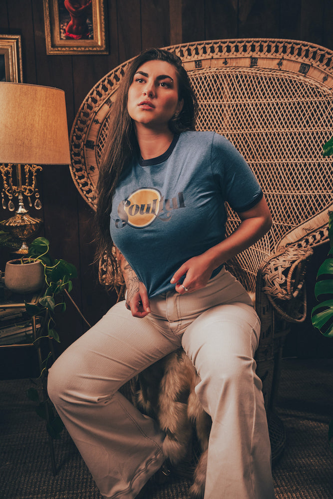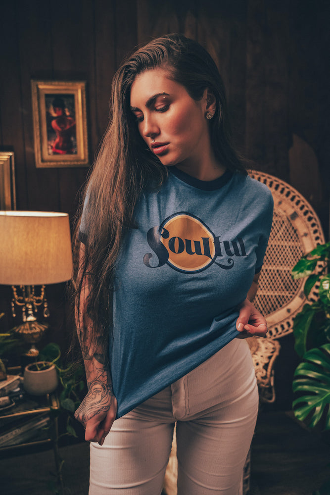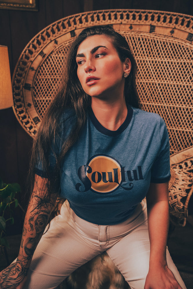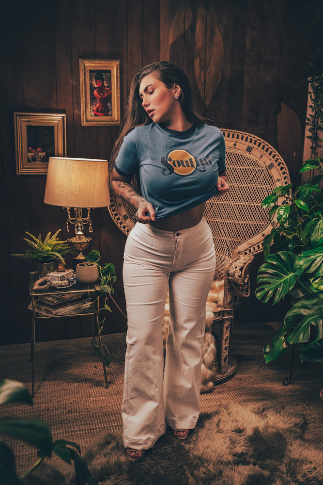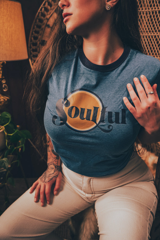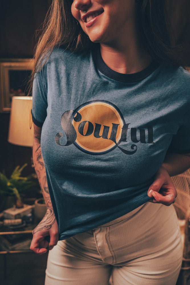 Restez cool et authentique avec notre t-shirt rétro à col rond et imprimé graphique, confectionné en 100 % coton pour un look vintage authentique. Avec son inscription « Soulful » audacieuse et ses finitions contrastées, ce basique inspiré des années 70 est fait pour les esprits libres, les mélomanes et les adeptes du groove qui aiment un style avec une touche funky.