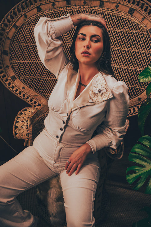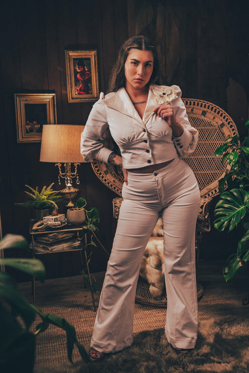 Notre veste courte Farrah en velours côtelé est un rêve rétro, avec ses longues manches bouffantes tulipe, ses poignets et sa taille contrastés en satin et son col oversize pour un glamour iconique des années 70. Associez-la à notre pantalon évasé taille haute Joan pour un look tailleur affirmé, à la fois vintage et moderne.